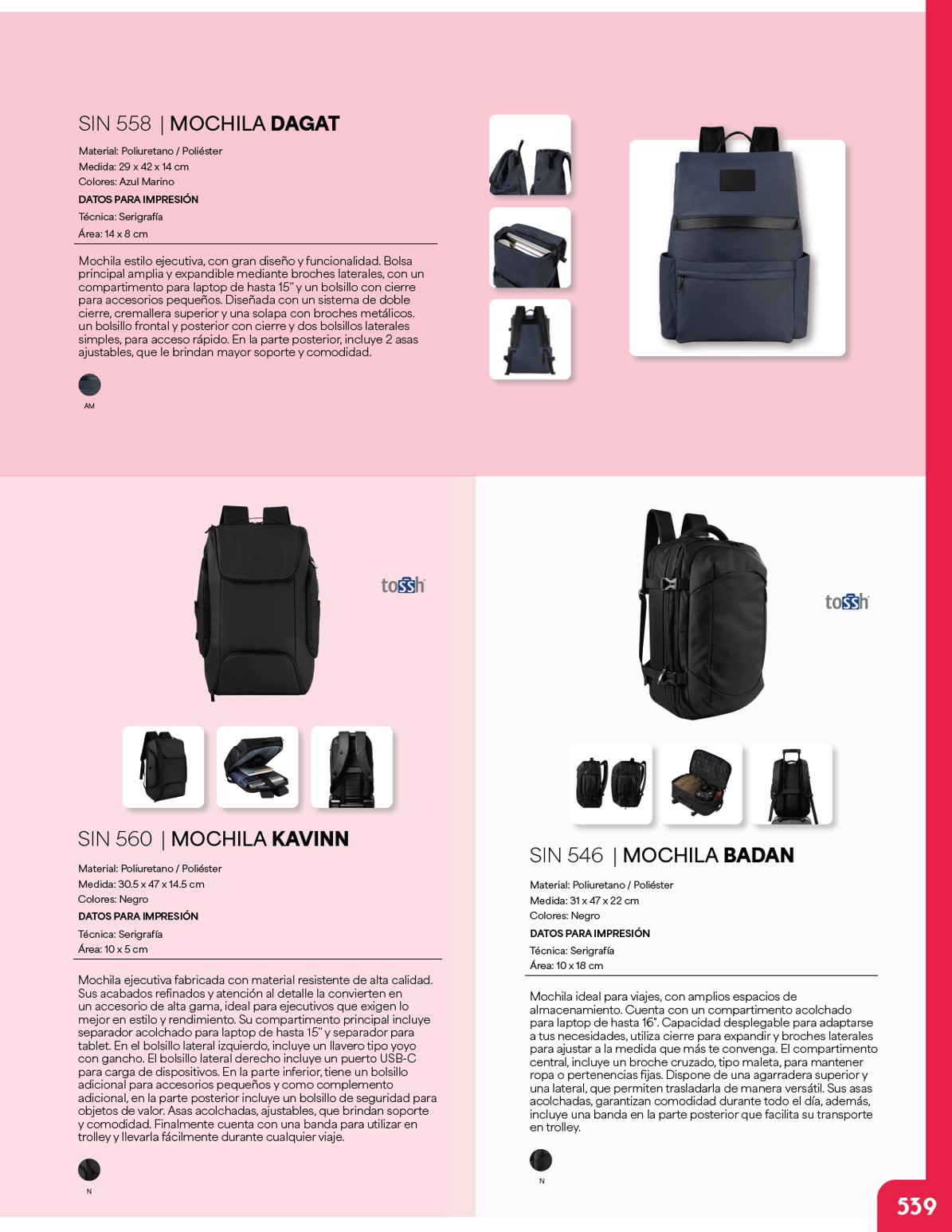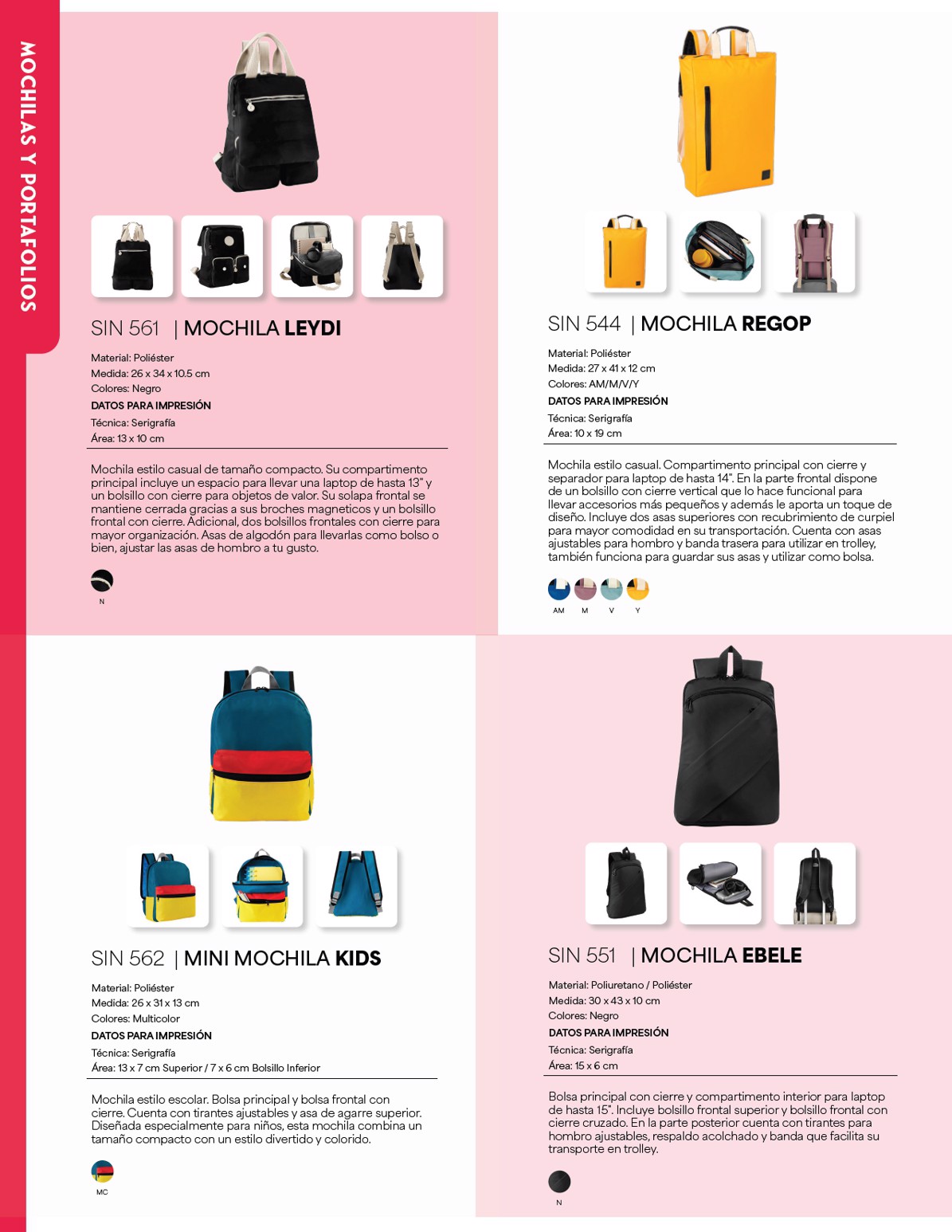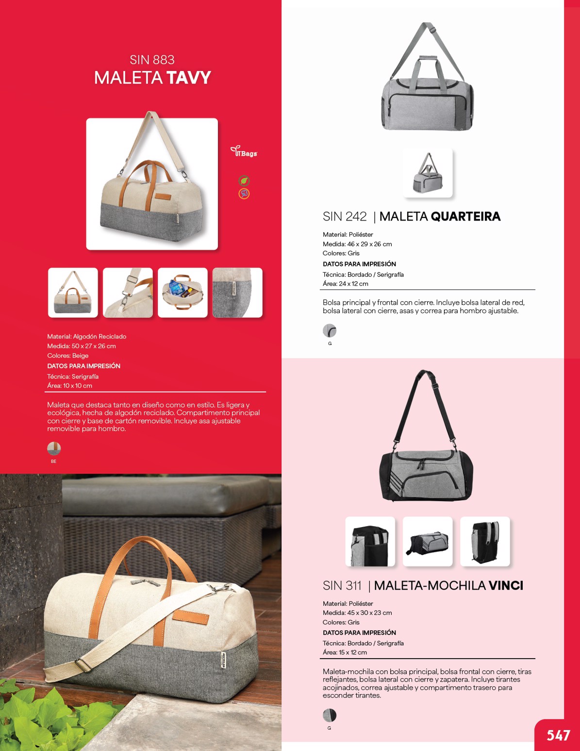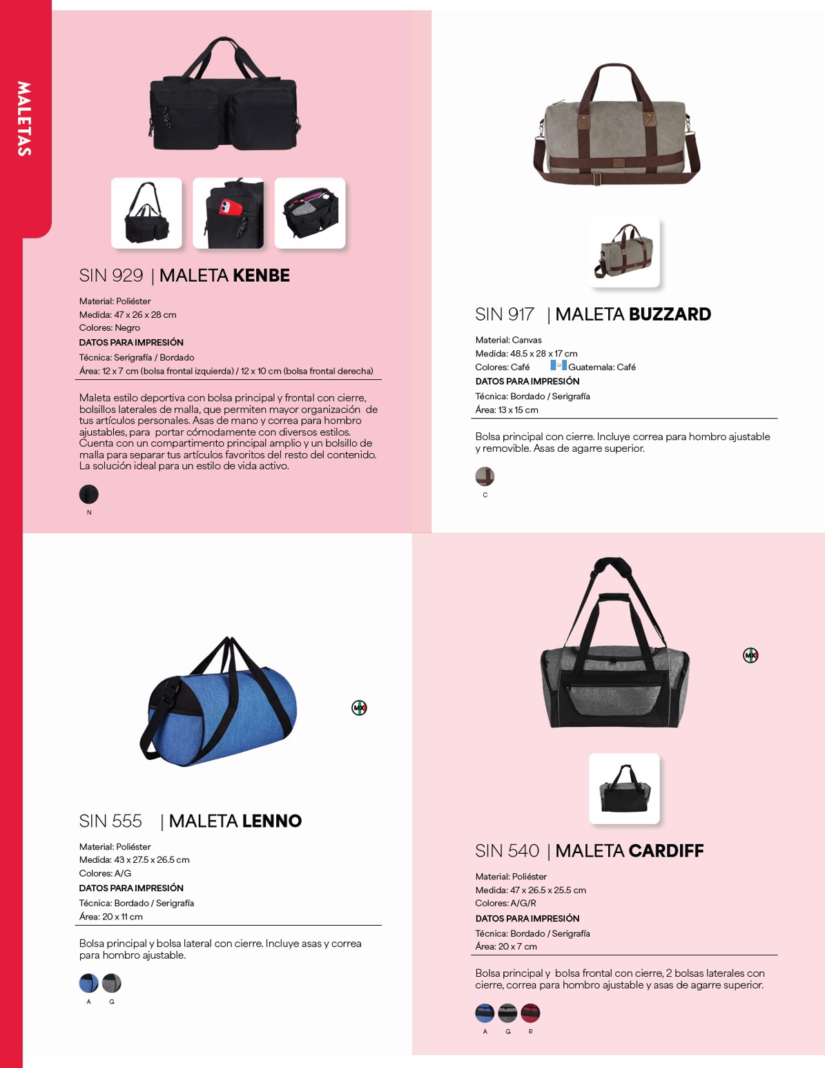 MALETAS SIN 821 | MALETA TROLLEY KLINK Material: Plástico ABS Exterior / Poliéster Interior Medida: 40 x 55 x 20 cm Colores: A/G/N/P/R DATOS PARA IMPRESIÓN Técnica: Láser / Serigrafía Área: 5 x 2.3 cm Maleta con diseño plegable, se pliega hasta 7 cm. Diseñada para ahorrar espacio y poderla almacenar bajo tu cama o tu closet. Carry On de 20 pulgadas, fabricada en plástico ABS que la hace resistente y duradera, 4 llantas spinner con deslizamiento silencioso. Su tamaño la hace ideal para viajes cortos o de negocios. Incluye placa metálica para grabado. A G N P R SIN 713 MALETA HANAE Material: Estireno / Poliéster Medida: 35 x 49 x 22 cm Colores: Negro DATOS PARA IMPRESIÓN Técnica: Láser en Placa Metálica Área: 4 x 0.8 cm Maleta carry-on que combina estilo, funcionalidad y seguridad, ideal para viajes cortos. Diseño que brinda un amplio espacio y organización impecable, cuenta con compartimentos internos para accesorios y artículos personales. Incorpora un candado de combinación para mayor seguridad. Cuenta con cuatro ruedas de giro suave y asa retráctil con dos niveles ajustables que facilitan su adecuada movilización. N SIN_821 SIN_713